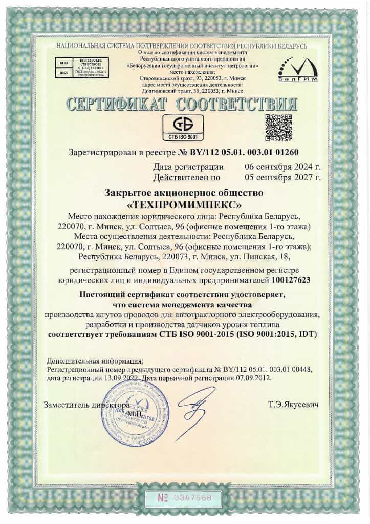 Настоящий сертификат соответствия удостоверяет, что система менеджмента качества производства жгутов проводов для автотракторного электрооборудования, разработки и производства датчиков уровня топлива соответствует требованиям СТБ ISO 9001-2015. Соответствующий сертификат служит свидетельством стабильного высокого качества продукции предприятия.