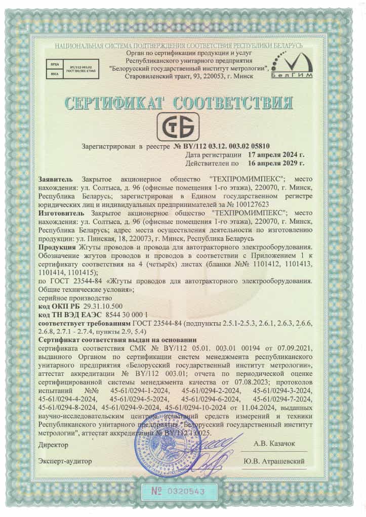 Сертификат выдан ЗАО «ТЕХПРОМИМПЕКС», подтверждающий соответствие требованиям стандарта качества продукции — жгутов проводов и проводов для автотракторного электрооборудования, выполненных согласно конструкторской и технологической документации по ГОСТ 23544-84.