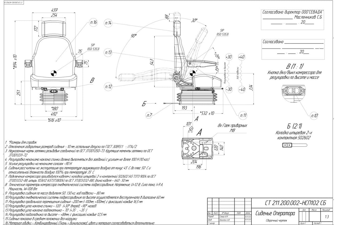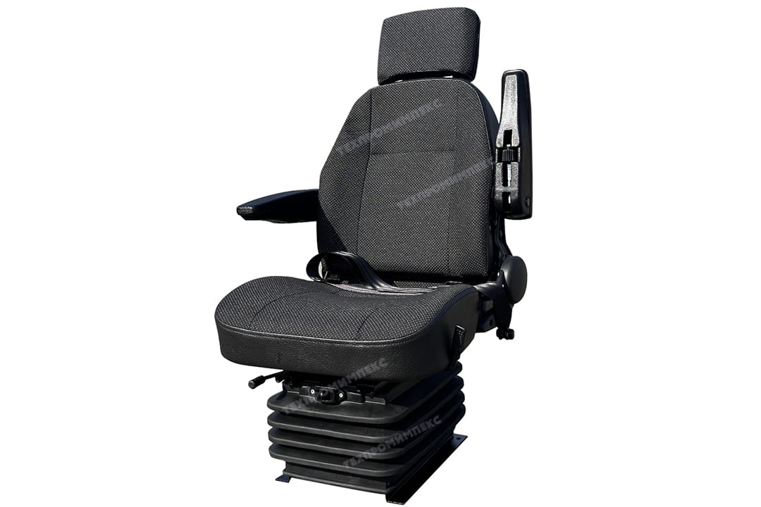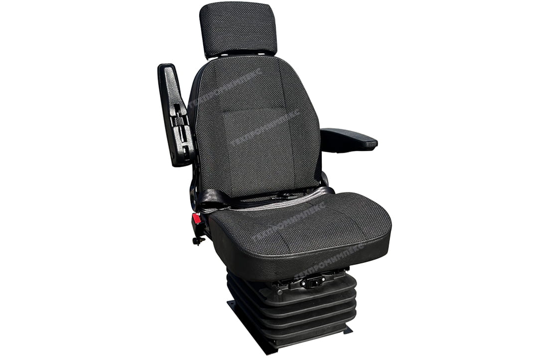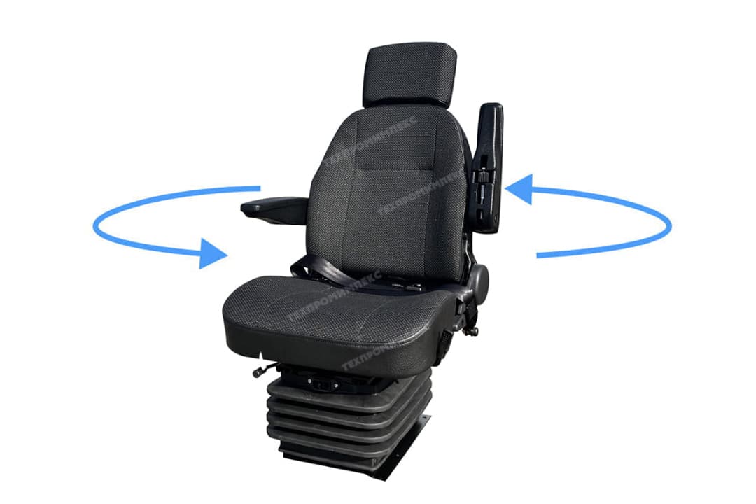 Сиденье поворотное оператора с эргономичными подушкой и спинкой в комбинированной обивке на пневматической системе подрессоривания со встроенным компрессором с регулируемыми подлокотниками и подголовником.
