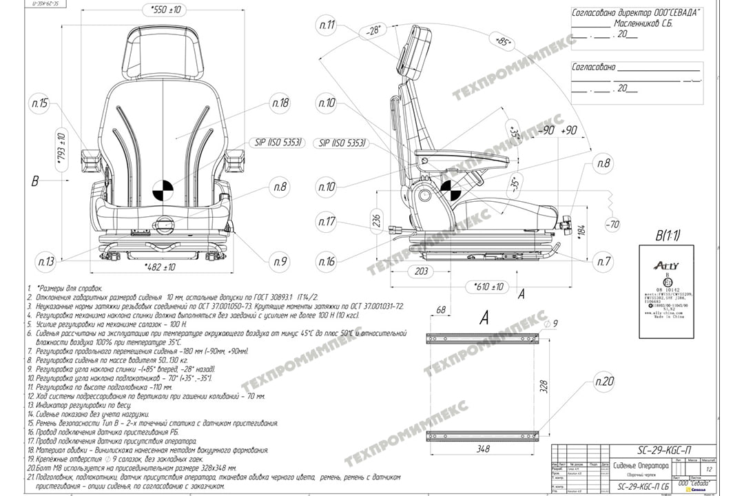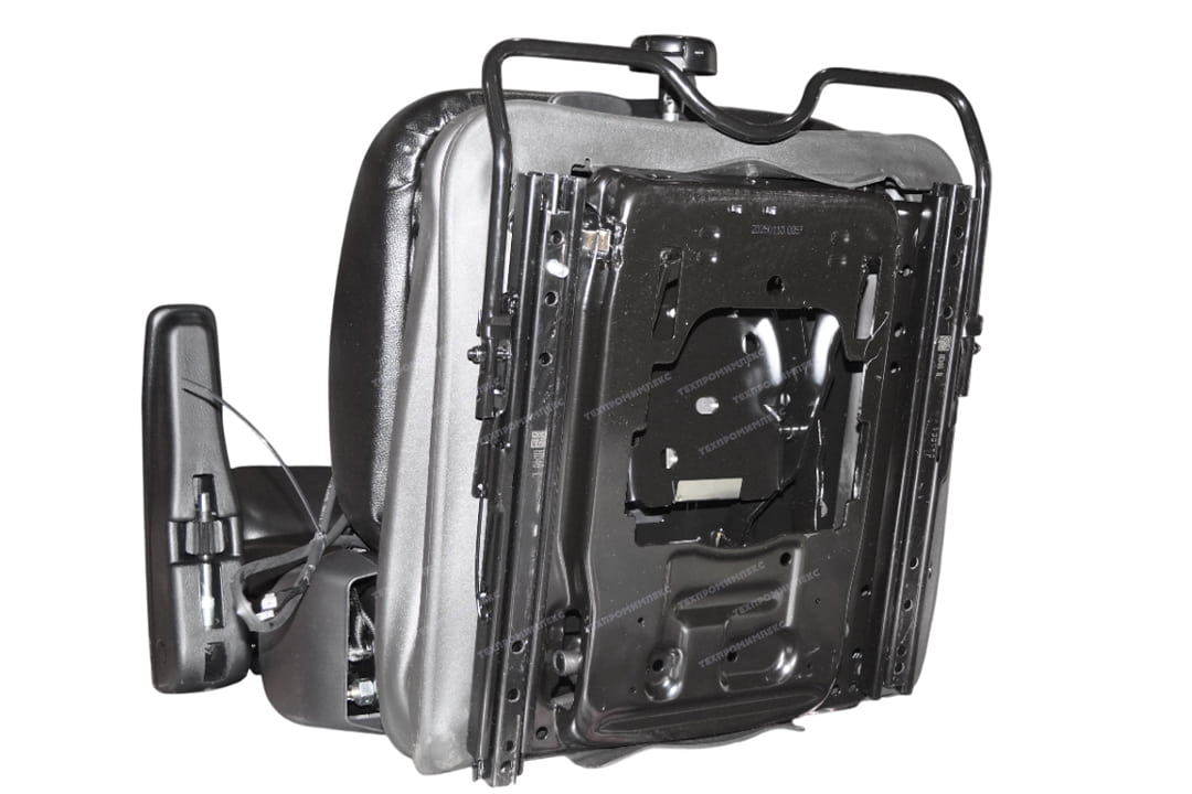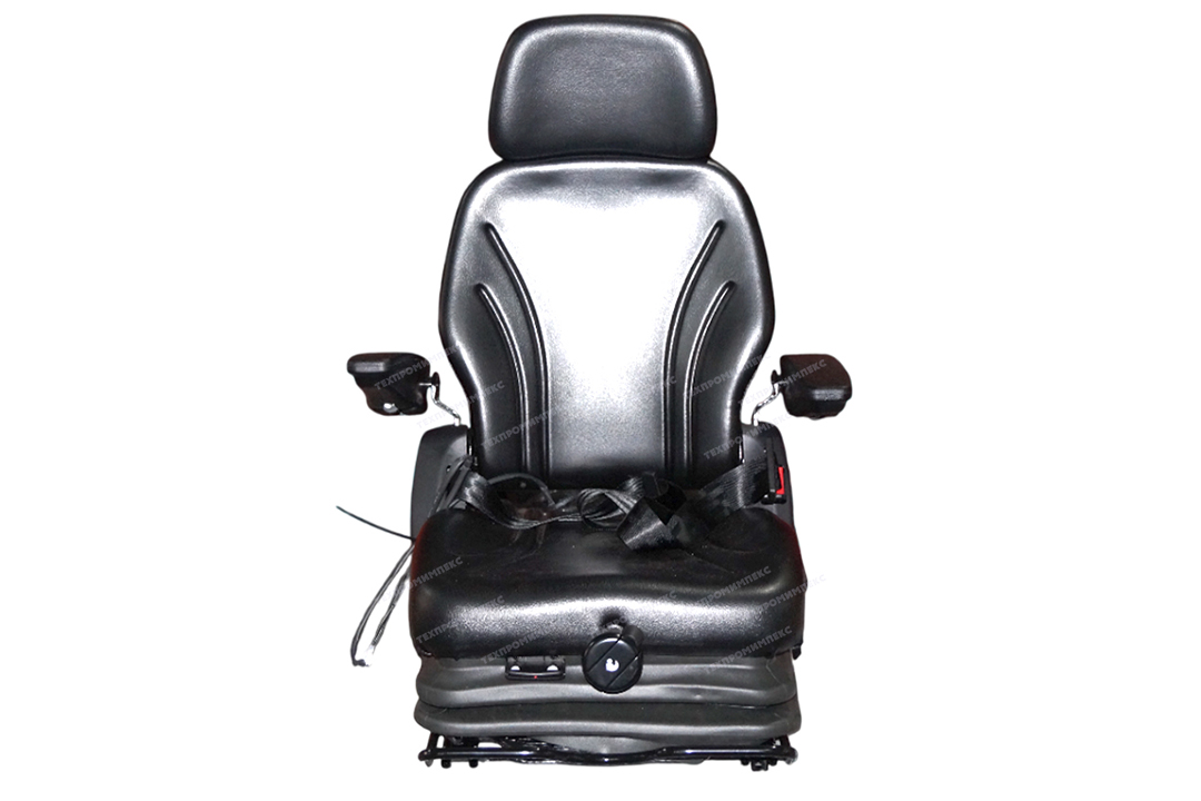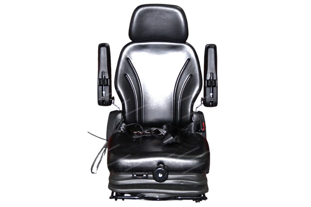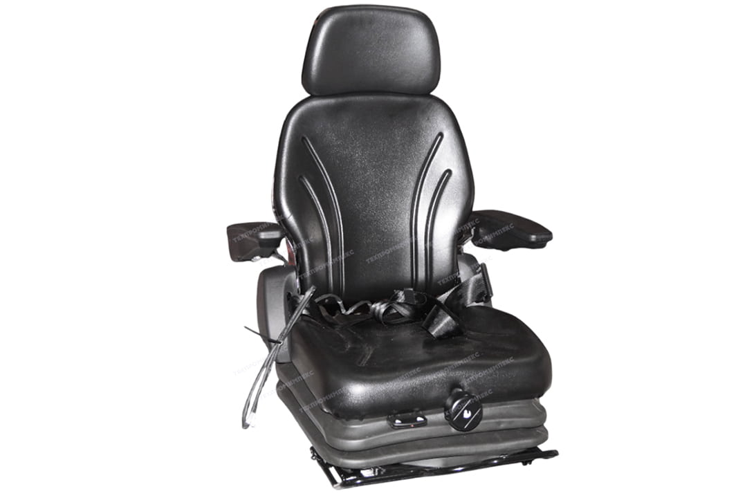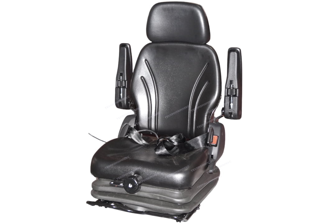 Сиденье с полноценной низкой системой подрессоривания с регулировкой по весу, на салазках, со складной спинкой, подголовником, датчиком присутствия оператора, подлокотниками, ремнем безопасности.